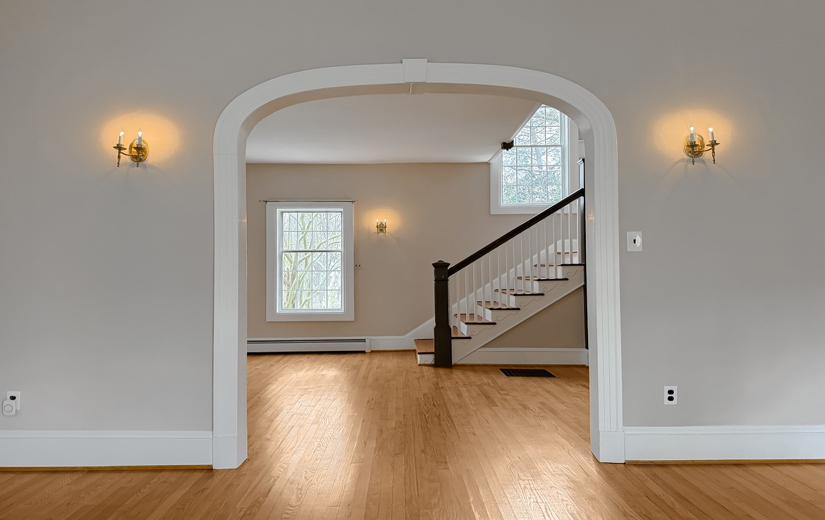 A welcoming grand foyer opens to an expansive Living room and an elegant Dining room featuring built-in cabinetry and gleaming hardwood floors that extend throughout the home. The bright, open kitchen is equipped with newer stainless-steel appliances and flows seamlessly into a casual Dining and Family gathering area. Custom built-ins provide dedicated desk and computer space, while a nearby laundry area and secondary staircase add everyday convenience. A spacious half bath completes the main level. Generous room sizes and graceful flow make the home ideal for entertaining—having hosted weddings, receptions, holiday celebrations, and countless gatherings where guests enjoyed the peaceful setting and remarkable water views.